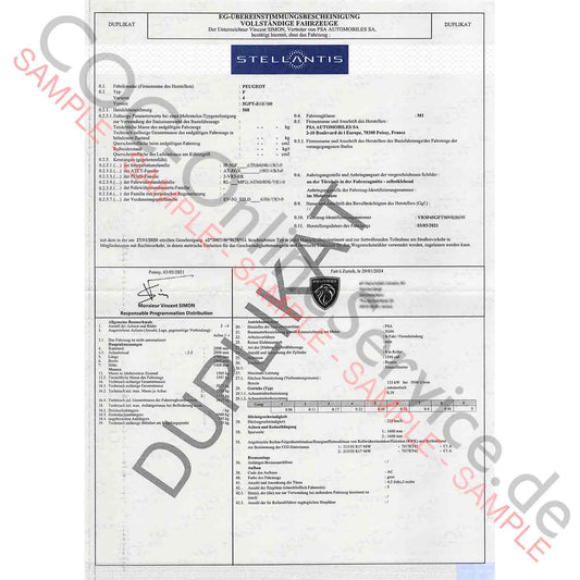 Έγγραφα COC για την Peugeot (πιστοποιητικό συμμόρφωσης)