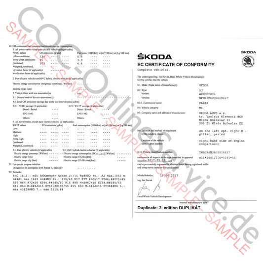 Έγγραφα COC για Skoda (Πιστοποιητικό συμμόρφωσης)