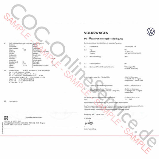 Έγγραφα COC για VW Volkswagen (Πιστοποιητικό συμμόρφωσης)